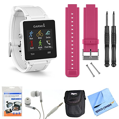 Garmin vivoactive GPS Smartwatch - White (010-01297-01) Berry Replacement Band Bundle includes White vivoactive GPS Smartwatch, Berry Replacement Band, Screen Protectors, Headphones, Carrying Case and Micro Fiber Cloth