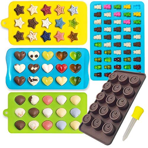 Candy Molds & Silicone Chocolate Mold | Jello & Ice Cube Trays | Set of 4 | Non Stick & BPA Free | Hearts, Stars, Shells & Gummy plus 1 dropper - by Lucentee