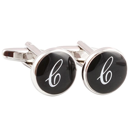 HJ Men's 2PCS Rhodium Plated Cufflinks Silver Initial Letter Shirt Wedding Business 1 Pair Set Black C