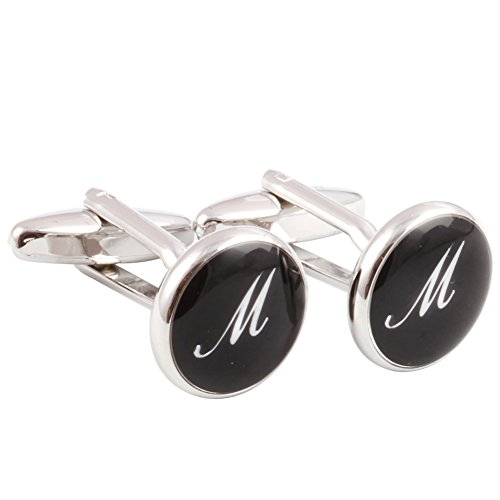 HJ Men's 2PCS Rhodium Plated Cufflinks Silver Initial Letter Shirt Wedding Business 1 Pair Set Black M