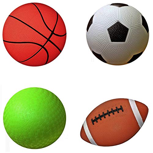 AppleRound Pack of 4 Sports Balls with 1 Pump: 1 Each of 5" Soccer Ball, 5" Basketball, 5" Playground Ball, and 6.5" Football (1-Pack, 4 Balls+1 Pump)