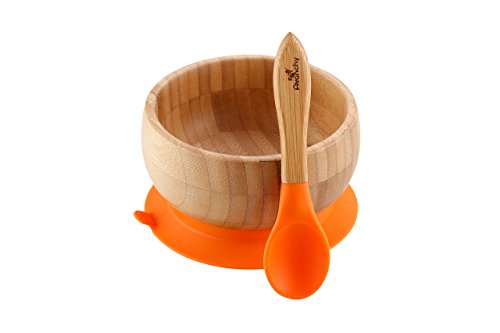 Avanchy - Baby Feeding Bowl and Spoon Set, Bamboo Bowl with Spill Proof, Stay Put Suction Ring, 5” × 3” Bowl Size - Orange