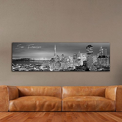 WallsThatSpeak Panoramic San Francisco Cityscape Picture, Black and White Stretched Canvas Art Prints, Wall Decoration for Bedroom or Office, Framed and Ready to Hang, 14” x 48”