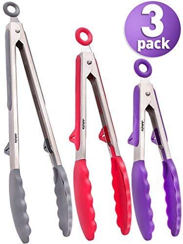 Silicone Kitchen Tongs Cooking Set - 3 Non-scratch Tongs - For All Your BBQ Grill and Serving Needs - Made From Long Lasting Stainless Steel with Silicone Tips - Non-slip Handles and Built-In Rests