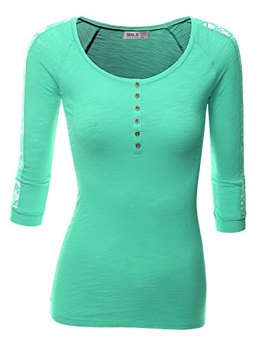 Doublju Slim Fit Cotton Blend Lace Trim Henley T-Shirt For Women With Plus Size MINT 3XL
