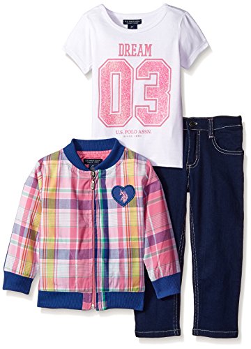 U.S. POLO ASSN. Little Girls' Bomber Jacket Graphic T-Shirt and Denim Jean Set