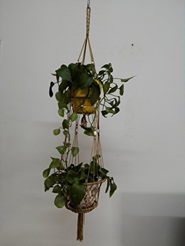 4 Legs Macrame Nylon Rope Plant Holders with Bamboo Ring Inside and White Wood Bead Decoration . Double Plates Coffee Color, 39-inches. (Without Pot and Hook)