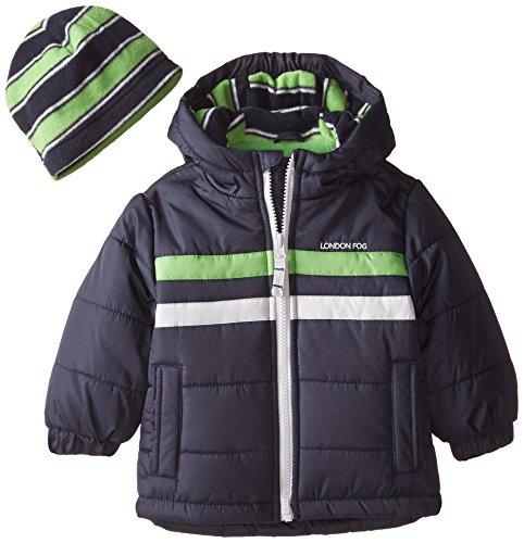 London Fog Baby Chest Stripe Puffer Coat with Hat, Navy, 24 Months