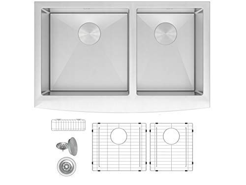 ZUHNE Turin 33 Inch Farmhouse Apron Front 60/40 Deep Double Bowl 16 Gauge Stainless Steel Kitchen Sink with Grate Protector, Two Drain Strainers and Sink Caddy