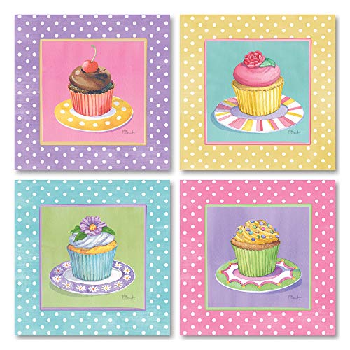 wallsthatspeak 4 Cute Colorful Cupcakes Art Prints Pastel Baking Kitchen Decor Paul Brent, Four 8 by 8-Inch Mounted Prints, Pink/Yellow/Blue/Lavender Pastels