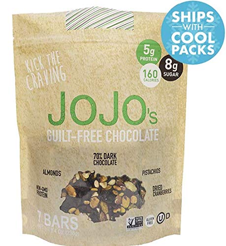 JOJO's Guilt Free Dark Chocolate Low Sugar, Low Carb, Added Protein, Pistachios, Almonds, and Dried Cranberries, 8.4oz Bag With 7 Bars, One Week Supply