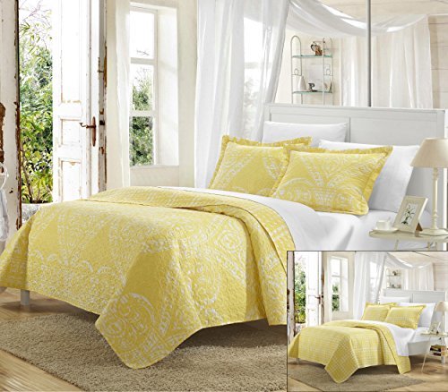 Perfect Home 3 Piece Pastola REVERSIBLE printed Quilt Set. Front a traditional pattern and Reverses into a houndstooth pattern, Queen, Yellow