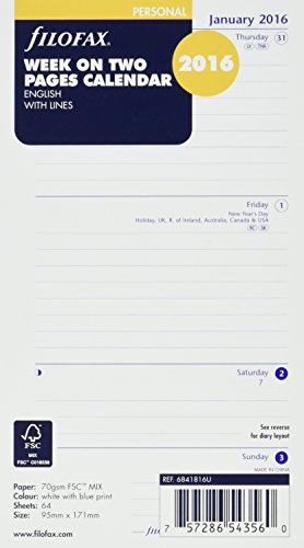 Filofax Week to View Refill for 2016 Personal/Compact Size Yearly Calendar, 6.75 x 3.75" (C68418-16)