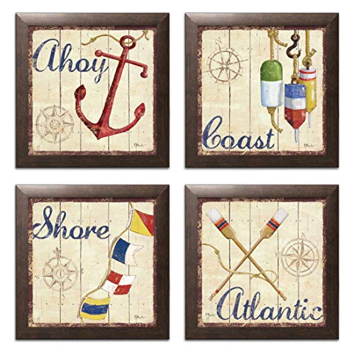 wallsthatspeak 4 Nautical Themed Sailing Art Prints Sailboat Boating Decor, 12 by 12-Inch, Brown Framed, Ready to Hang!