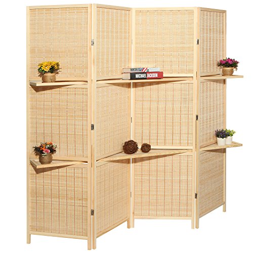 MyGift Deluxe Woven Beige Bamboo 4 Panel Folding Room Divider Screen w/Removable Storage Shelves