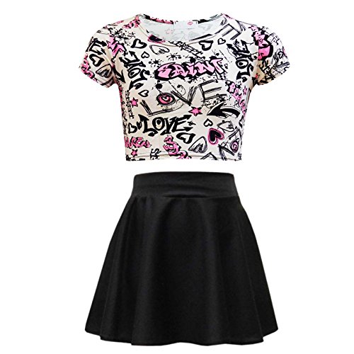 Kids Girls Love Graffiti Crop Top & Black Skater Skirt Set 7 8 9 10 11 12 13 Yr