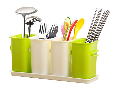 Honla Interlocking Plastic Flatware Caddy Organizer on Tray-Silverware,Cutlery,Utensil Drying Rack Holder for Kitchen Countertop/Dining Table Storage,4-Compartment Drainer,Lime Green and Cream