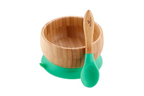 Avanchy - Baby Feeding Bowl and Spoon Set, Bamboo Bowl with Spill Proof, Stay Put Suction Ring, 5” × 3” Bowl Size - Green
