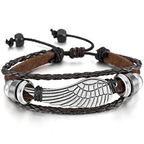 MOWOM Brown Alloy Genuine Leather Bracelet Bangle Angel Wing Surfer Wrap Adjustable