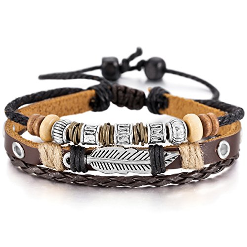 MOWOM Brown Silver Tone Alloy Genuine Leather Bracelet Angel Wing Feather Surfer Wrap Adjustable