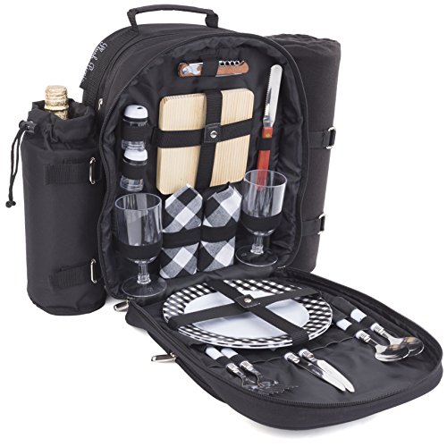 Plush Picnic - Picnic Bag Backpack/Insulated Picnic Basket, Detachable Bottle/Wine Holder, Fleece Blanket, Plates and Cutlery Set (2 Person)