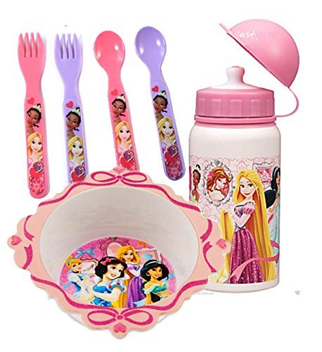 Disney 6 Piece, High Quality, Bowl, Sturdy Aluminum Water Bottle and 2 Sets of Flatware (Fork and Spoon) Set. Featuring Cinderella, Snow White, Rapunzel, Jasmine, Aura and Tiana.