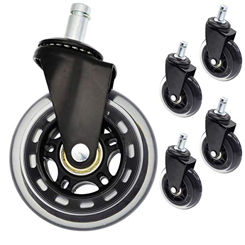 PU Office Chair Wheels Replacements, MythGeek 3 Inches Rollerblade Style Office Chair Silent Caster Wheels Anti-scratch Protection for Hard Floors with 7/16 x 7/8 inch Grip Ring Stem, Set of 5