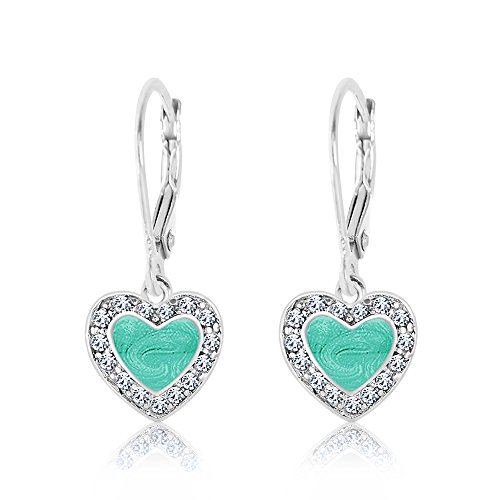 Kids Earrings - 925 Sterling Silver with a White Gold Tone Mint Green Enamel Heart with Surrounding Crystals Leverback Earrings MADE WITH SWAROVSKI ELEMENTS Kids, Children, Girls, Baby