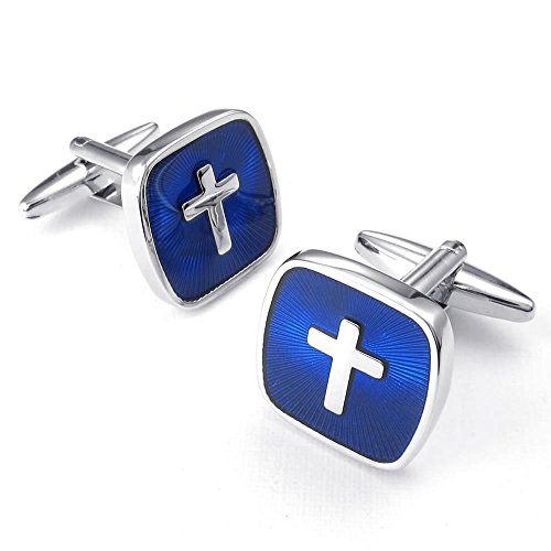 KONOV 2pcs Rhodium Plated Men's Classic Cross Square Shirts Cufflinks, Wedding, Blue Gold, 1 Pair