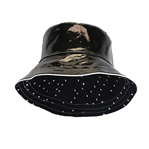 Black Patent Polka Dot Reversible Waterproof Bucket Rain Hat, Foldable, One Size