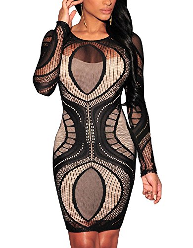 Cfanny Women's Lace Nude Illusion See Through Sleeves Bodycon Dress