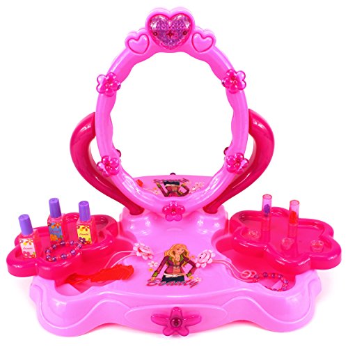 Velocity Toys Fashion Girl Table Top Pretend Play Battery Operated Toy Beauty Mirror Vanity Play Set w/ Flashing Lights, Sounds, Accessories