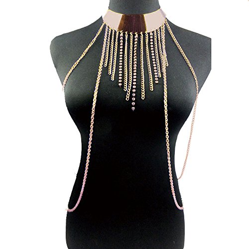 FM FM42 Gold-tone Women Multi Crystal Tassels Harness Body Chain with Choker Collar Necklace BC1031