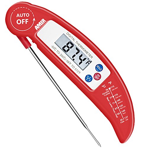 AMIR Digital Meat Thermometer, Instant Read Cooking Thermometer, Electronic Meat Thermometer With Probe for Kitchen, BBQ, Poultry, Grill Food & Candy- Foldable, Fast & Auto On Off (Red)