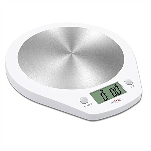 Famili Digital Electronic Kitchen Cooking Gram Scale Measuring Food Weight Scale with Stainless Steel Platform, 11lb/5kg, White