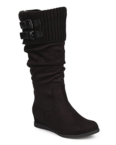 Wild Diva Women Suede Slouch Knee High Sweater Cuff Wedge Riding Boot DJ98 - Black Faux Suede