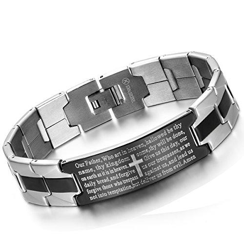 Flongo Men's Vintage Stainless Steel Black Cross Silver English Bible Lords Prayer Link Wrist Bracelet, 8.1 inch