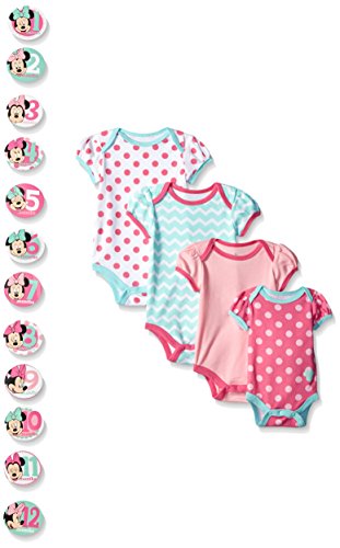 Disney Baby-Girls Grow with Me Bodysuits with 12 Monthly Minnie Stickers, Pink, Newborn-12 Months (Pack of 4)
