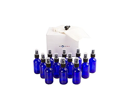 12 Cobalt Blue Glass Spray Bottles (2oz) with Dropper and Drawstring Bag
