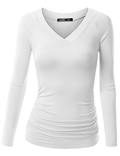 TWINTH Shirring Shirts Deep V-Neck Top Long Sleeve Drape Shirts White 2XL