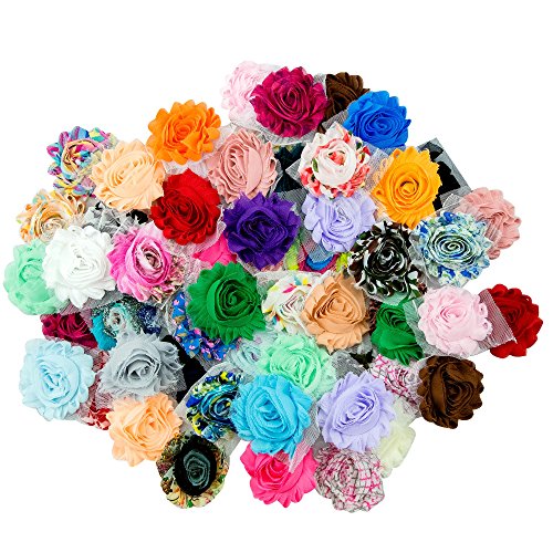 JLIKA (50 Pieces Shabby Flowers - Chiffon Fabric Roses - 2.5" - Solids and Prints Included - Assorted Color Mix - Single Flowers Grab Bag