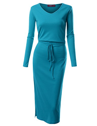 Doublju Long Sleeve Drawstring Waist V-Neck Cotton Blend Long Dress for Women with Plus Size Teal X Small