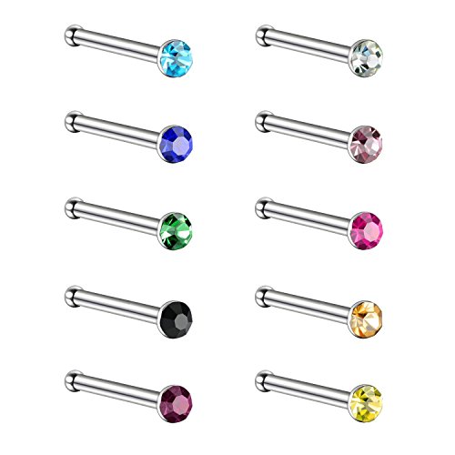 Charisma Stainless Steel Crystals Nose Studs Rings Bone Bar Pin Piercing Jewelry 10 Pcs Set Assorted Color