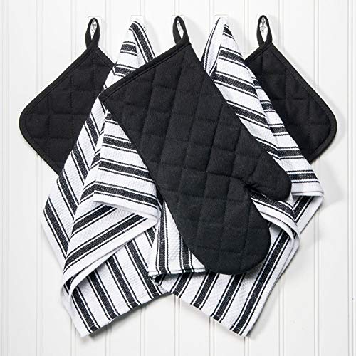 AZOKER Dish Towels, Pot Holders Oven Mitt 5-Piece Premium Kitchen Linen Set Saybrook, 100% Cotton, Black/White