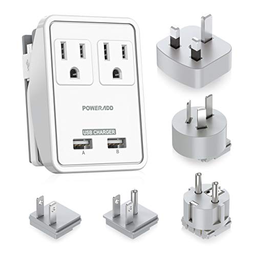 POWERADD Travel Adapter Kit - Dual USB Ports + 2 Outlets, Universal Adapters for UK, US,Japan,China, Europe, Asia, Cruise Ship Travel, Perfect for Cellphone Laptop Camera and More - UL Listed