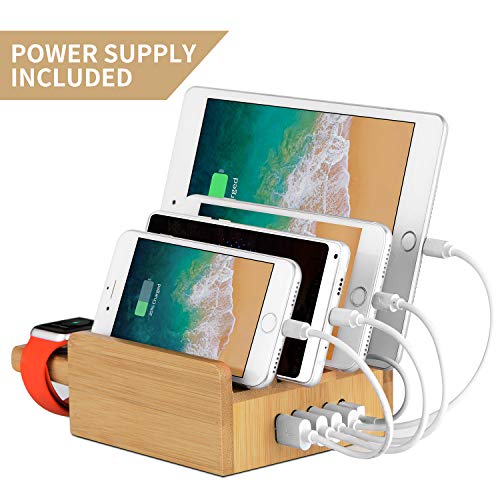 Upow 5-Port USB Charging Station Dock Apple Watch Stand Bamboo Multi Device Organizer Fast Charging Smart Phones, Tablets - iPhone, Ipad, Samsung Galaxy Others