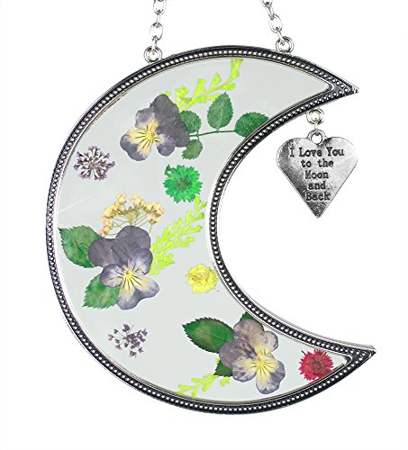 BANBERRY DESIGNS I Love You to The Moon and Back Suncatcher with Real Pressed Flowers in Glass and Silver Metal Heart Shaped Engraved Charm - Gift for a Loved One Wife Girlfriend Fiance