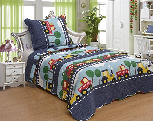 FT Home Fashion Kid's Dark Blue Cars Trucks Striped Print Twin Size Quilt Set, 2 Pieces