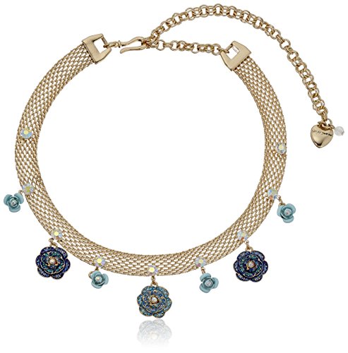 Betsey Johnson "Skulls and Roses" Shaky Multi-Pave Flower Mesh Choker Necklace, 12"