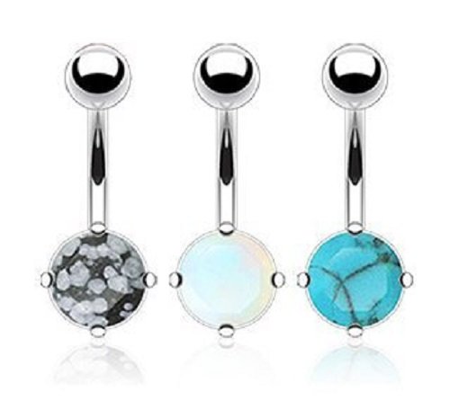 3 Piece Lot - Semi Precious Stones Opalite, Snowflake Obsidian & Blue Turquoise Belly Navel Piercing Bar Ring Jewelry 316L Surgical Steel 14g